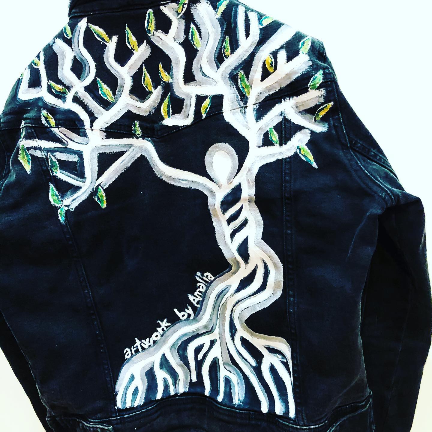 The painting illustrates the connection between the earth and heaven, the bond and affection between humans and nature. The tree is sacred in some cultures.